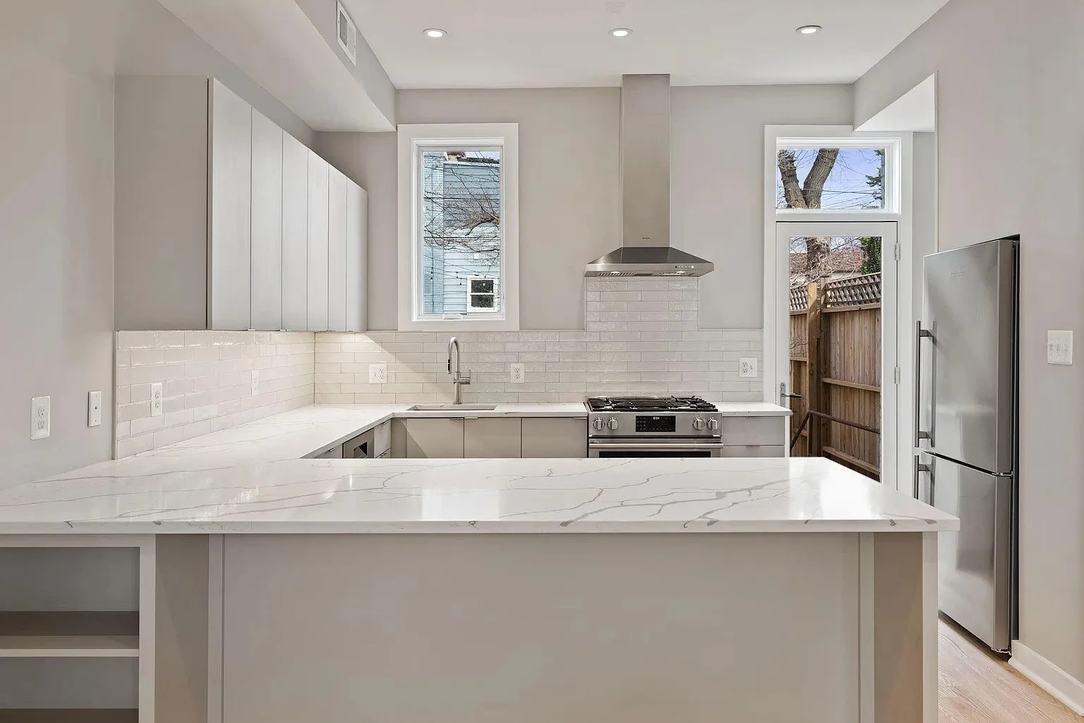 This renovation was done for a client just starting out as a rental property owner who wanted to update their newly purchased unit to attract renters. The kitchen was outdated, and the client wanted to open the space into the living room. This provided an opportunity to increase counter space and rearrange appliances for better flow and functionality. Finishes were chosen for simplicity and durability for a rental unit. Light colors allowed the limited natural light to reflect into the space.
